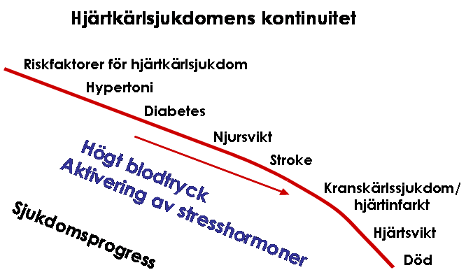 Den överbelastning på hjärtkärlsystemet som ett ofysiologiskt högt blodtryck innebär leder i sin tur till ökade halter av stresshormoner, vilket ytterligare driver sjukdomsprocessen framåt. Ökning av stresshormoner kan förekomma redan mycket tidigt i den kardiovaskulära sjukdomsprocessen. I tidiga stadier ses höjda halter oftast endast lokalt i vävnaderna, såsom i hjärtmuskeln (myokardiet) och i njurvävnad, men också i blodkärlsväggar. Däremot kan man sällan i tidiga stadier av kardiovaskulär sjukdom uppmäta förhöjda stresshormoner i blodet.